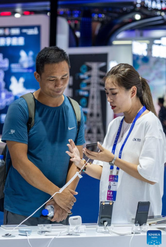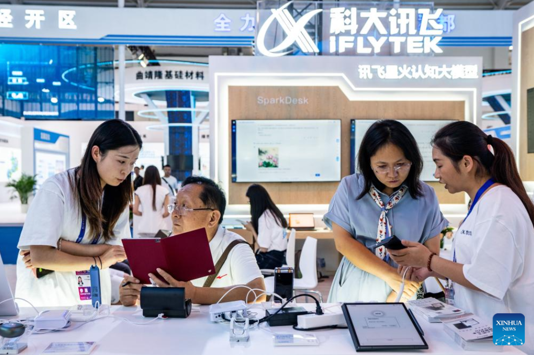 Visitors learn about digital products at the booth of iFLYTEK at the seventh China-South Asia Expo in Kunming, southwest China's Yunnan Province, Aug. 16, 2023. The seventh China-South Asia Expo kicked off Wednesday in Kunming.
