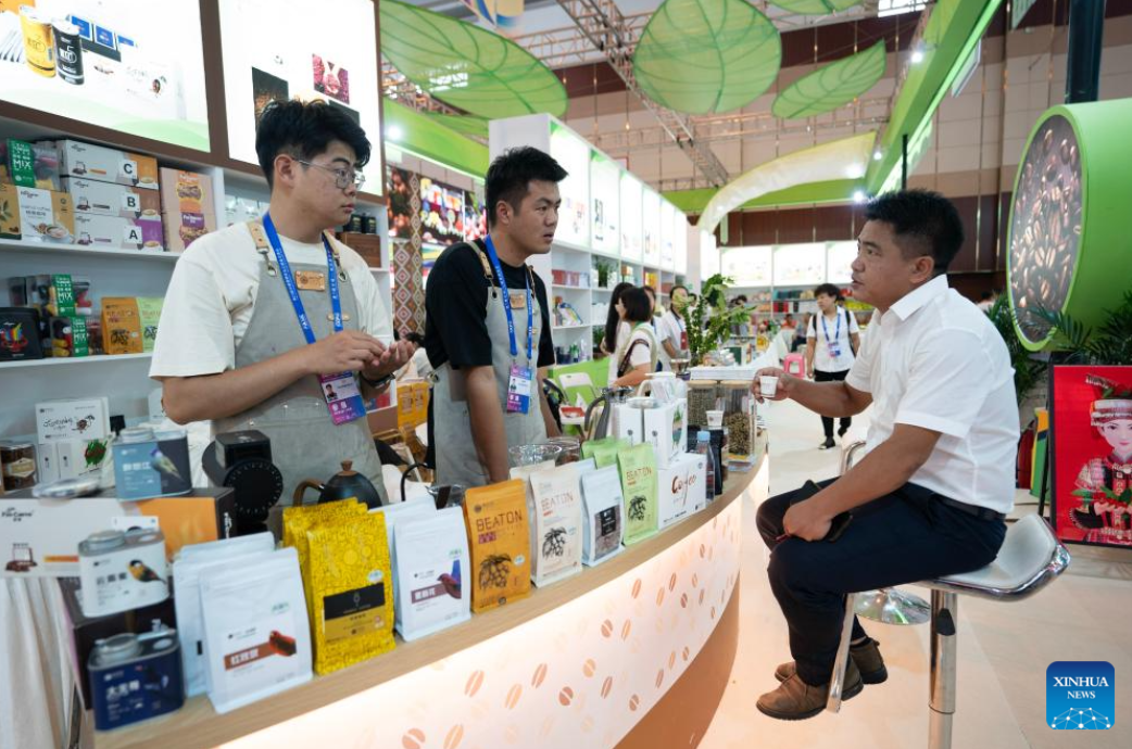 Exhibitors introduce coffee products at the seventh China-South Asia Expo in Kunming, southwest China's Yunnan Province, Aug. 16, 2023. The seventh China-South Asia Expo kicked off Wednesday in Kunming.