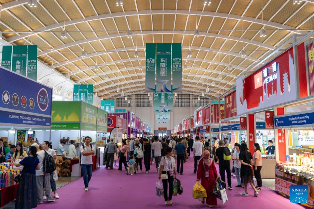 This photo taken on Aug. 16, 2023 shows a view of Southeast Asia Pavilion at the seventh China-South Asia Expo in Kunming, southwest China's Yunnan Province. The seventh China-South Asia Expo kicked off Wednesday in Kunming.