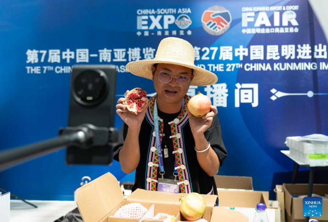 A staff member sells agricultural products through livestreams at the seventh China-South Asia Expo in Kunming, southwest China's Yunnan Province, Aug. 16, 2023. The seventh China-South Asia Expo kicked off Wednesday in Kunming.