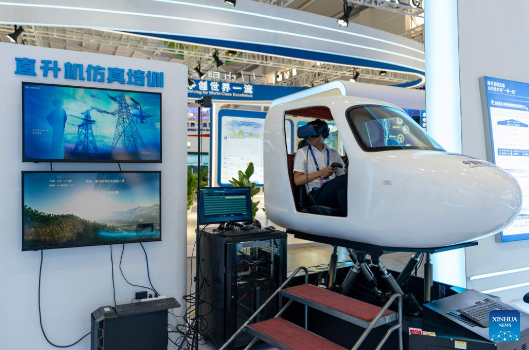 A staff member of China Southern Power Grid (CSG) presents a helicopter training simulator for power patrol at the seventh China-South Asia Expo in Kunming, southwest China's Yunnan Province, Aug. 16, 2023. The seventh China-South Asia Expo kicked off Wednesday in Kunming.