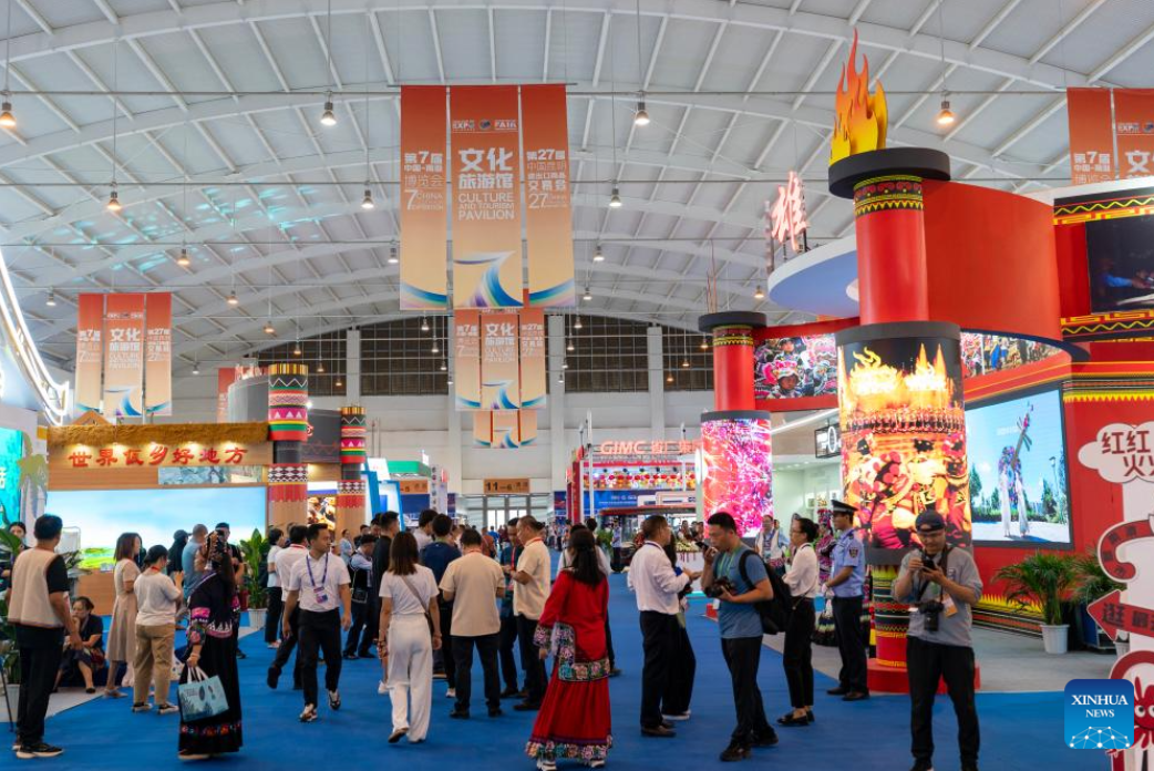 This photo taken on Aug. 16, 2023 shows a view of Culture and Tourism Pavilion at the seventh China-South Asia Expo in Kunming, southwest China's Yunnan Province. The seventh China-South Asia Expo kicked off Wednesday in Kunming.