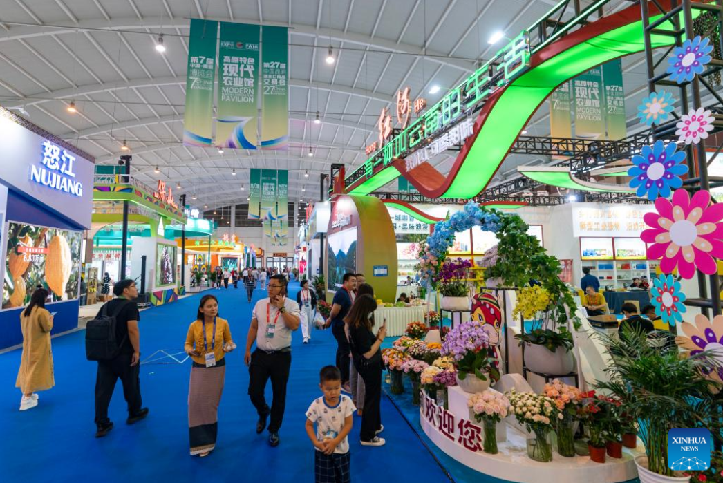 This photo taken on Aug. 16, 2023 shows a view of Modern Plateau Agriculture Pavilion at the seventh China-South Asia Expo in Kunming, southwest China's Yunnan Province. The seventh China-South Asia Expo kicked off Wednesday in Kunming.