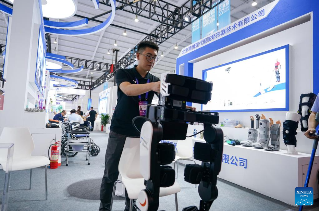 An exhibitor presents a walking aid product at the seventh China-South Asia Expo in Kunming, southwest China's Yunnan Province, Aug. 16, 2023. The seventh China-South Asia Expo kicked off Wednesday in Kunming.