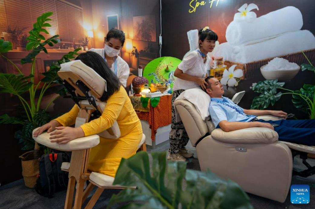 Visitors experience Thai-style massage at the Southeast Asia Pavilion at the seventh China-South Asia Expo in Kunming, southwest China's Yunnan Province, Aug. 16, 2023. The seventh China-South Asia Expo kicked off Wednesday in Kunming.