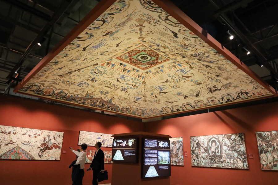 Attendees visit an exhibition themed on Dunhuang culture at the sixth Silk Road (Dunhuang) International Cultural Expo in Dunhuang, northwest China's Gansu Province, Sept. 6, 2023. (Xinhua/Ma Xiping)