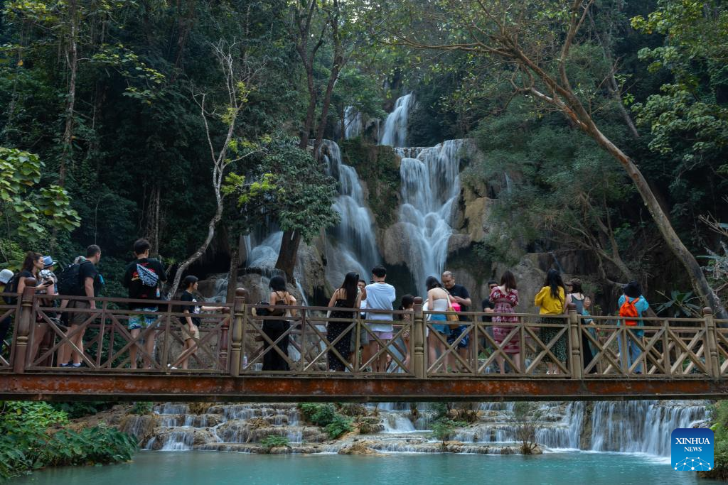 Tourists visit a waterfall in Luang Prabang, Laos, Feb. 16, 2024. The China-Laos Railway is witnessing its first Spring Festival travel rush since the railway started cross-border passenger services on April 13, 2023. Laos embraced a boost in tourism thanks to the passenger flow brought by the China-Laos Railway during the Spring Festival holiday. (Photo by Kaikeo Saiyasane/Xinhua)