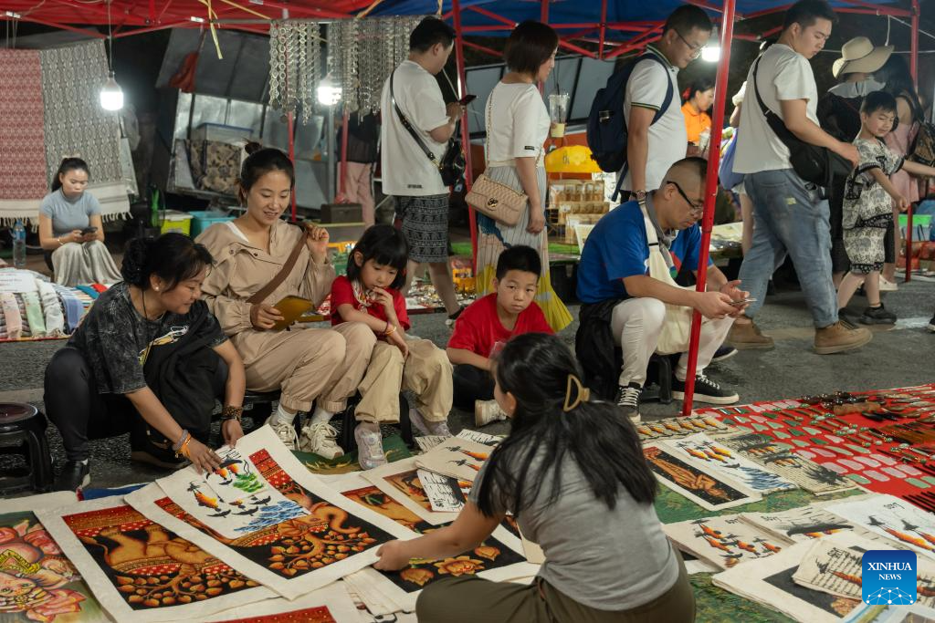 Tourists buy handicraft products at a fair in Luang Prabang, Laos, Feb. 16, 2024. The China-Laos Railway is witnessing its first Spring Festival travel rush since the railway started cross-border passenger services on April 13, 2023. Laos embraced a boost in tourism thanks to the passenger flow brought by the China-Laos Railway during the Spring Festival holiday. (Photo by Kaikeo Saiyasane/Xinhua)