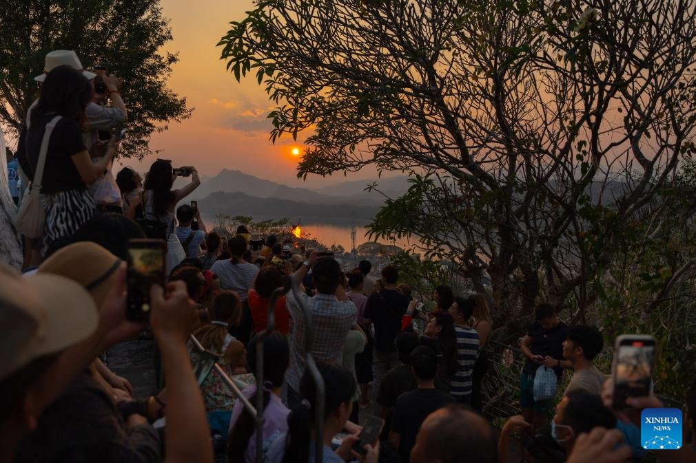 Tourists watch the sunset in Luang Prabang, Laos, Feb. 16, 2024. The China-Laos Railway is witnessing its first Spring Festival travel rush since the railway started cross-border passenger services on April 13, 2023. Laos embraced a boost in tourism thanks to the passenger flow brought by the China-Laos Railway during the Spring Festival holiday. (Photo by Kaikeo Saiyasane/Xinhua)