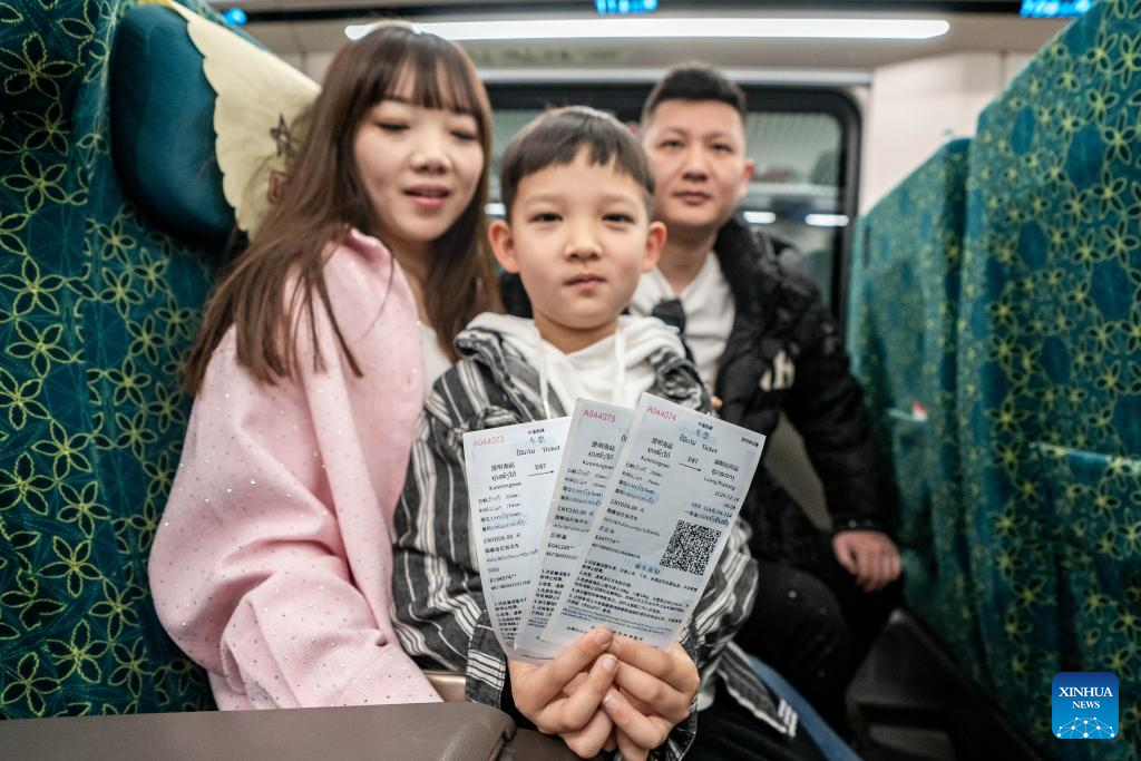 Passengers bound for Laos display their train tickets of China-Laos Railway in Kunming, southwest China's Yunnan Province, Feb. 14, 2024. The China-Laos Railway is witnessing its first Spring Festival travel rush since the railway started cross-border passenger services on April 13, 2023. Laos embraced a boost in tourism thanks to the passenger flow brought by the China-Laos Railway during the Spring Festival holiday. (Xinhua/Hu Chao)