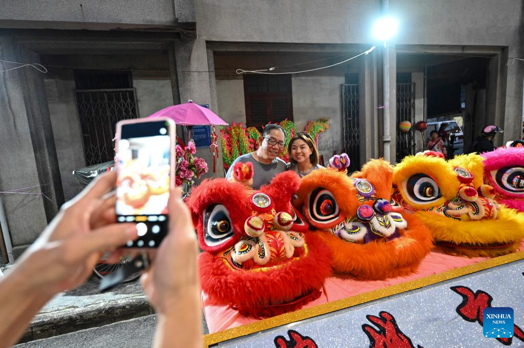 People pose for a photo with lion dance props during the Penang Chinese New Year Celebration in George Town, Penang, Malaysia, Feb. 18, 2024. (Photo by Xu Xinyu/Xinhua)