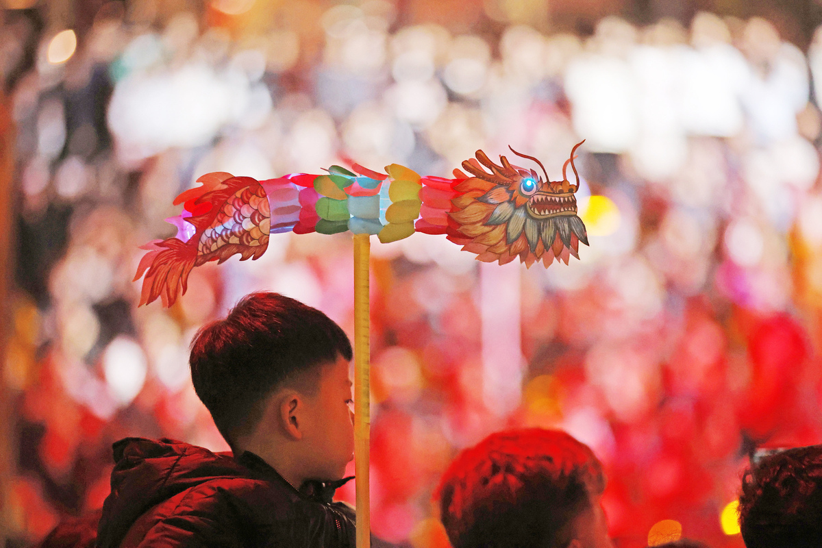 A boy holding a dragon-shaped lantern watches a show at a Spring Festival temple fair in Yancheng county, East China's Shandong province, Feb 12, 2024. [Photo/Xinhua]