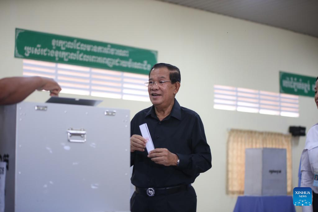 Former Cambodian Prime Minister Samdech Techo Hun Sen, president of the CPP, cast his ballot at a polling station in southern Kandal province, as his son, incumbent Prime Minister Hun Manet, voted in the capital Phnom Penh.