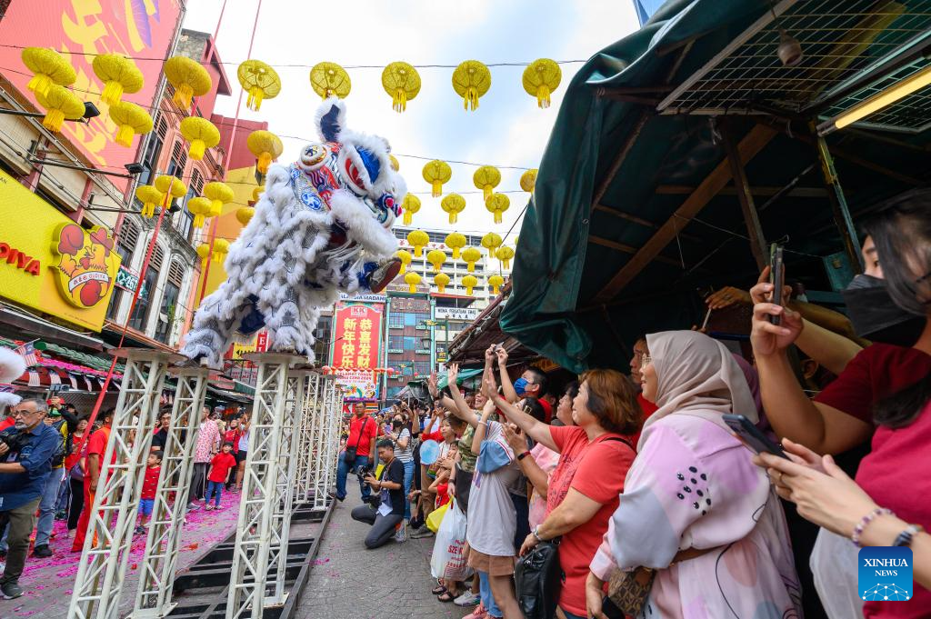 Members of a lion dance troupe perform during the Lantern Festival celebration at Petaling Street of Kuala Lumpur, Malaysia, Feb. 24, 2024. (Photo by Chong Voon Chung/Xinhua)