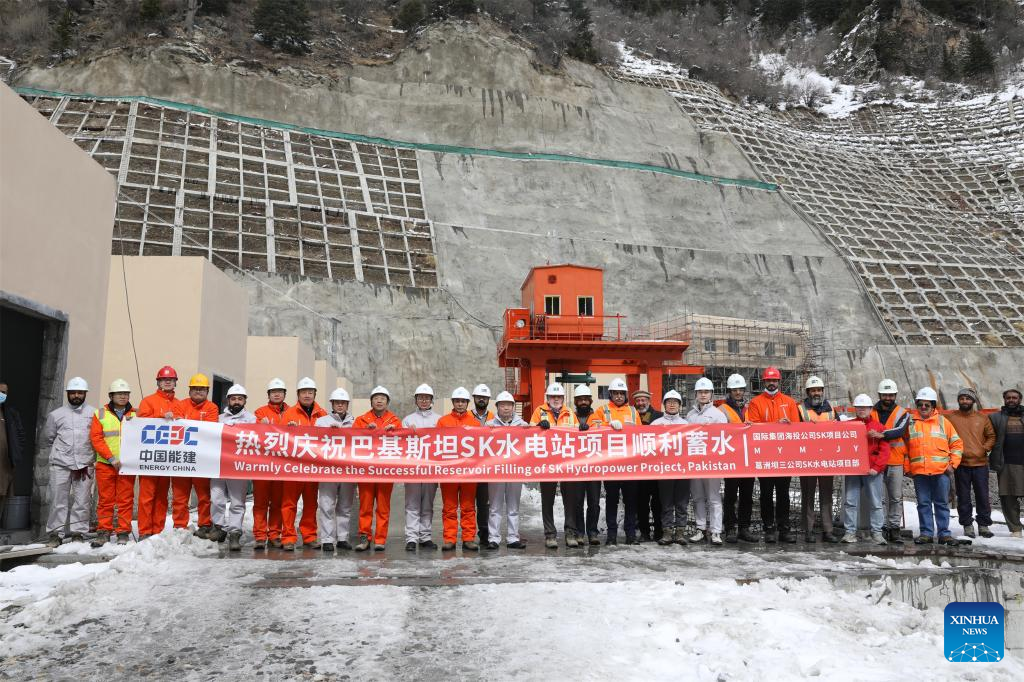 Chinese and Pakistani engineers celebrate the impoundment of the China-built Suki Kinari Hydropower station in the Mansehra district of Pakistan's Khyber Pakhtunkhwa province, Feb. 28, 2024. The China-built Suki Kinari Hydropower station in northwest Pakistan started impoundment on Wednesday.