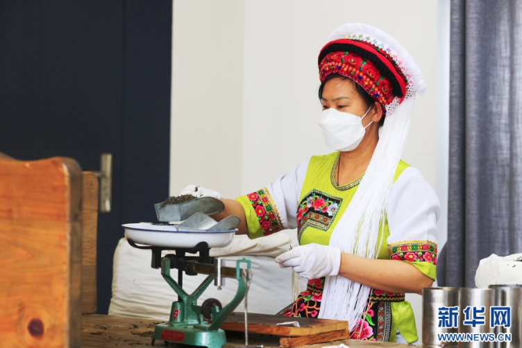 Photo taken on April 1st shows a staff weighing the tea at the traditional tea-making demonstration area of the Xiaguan Tuocha Tea House. (Xinhua/Zhao Pufan)