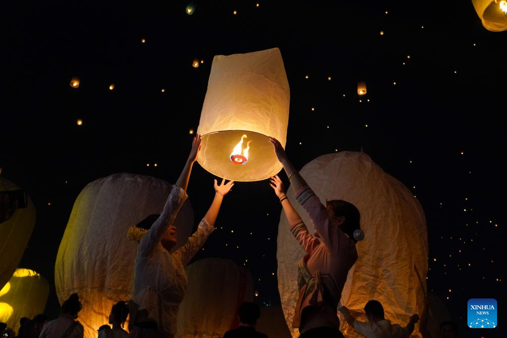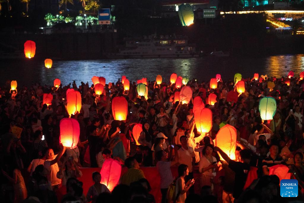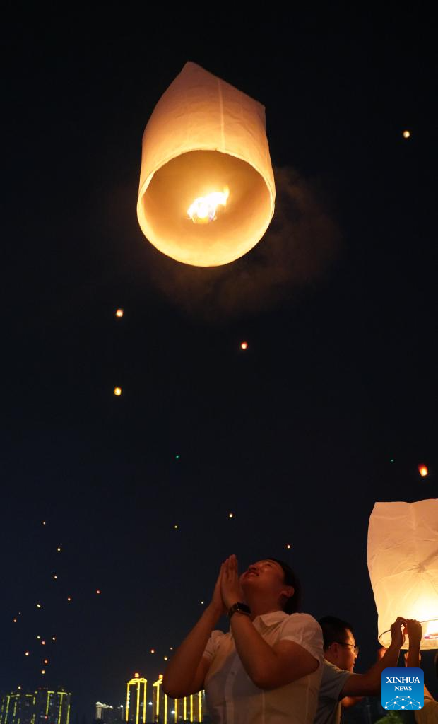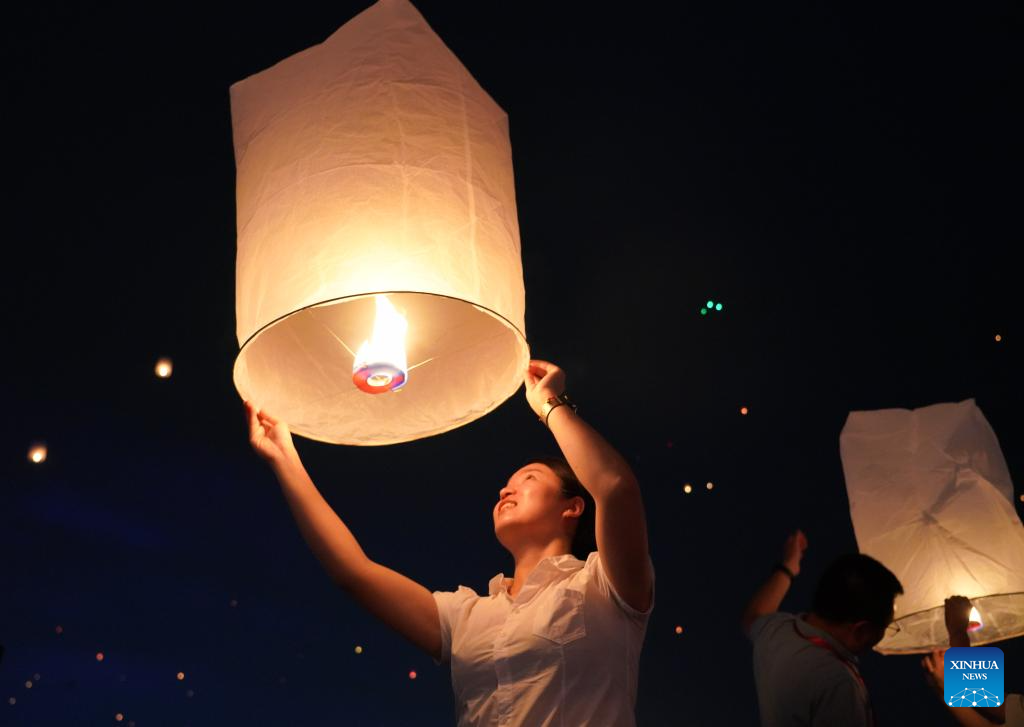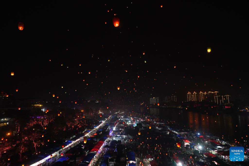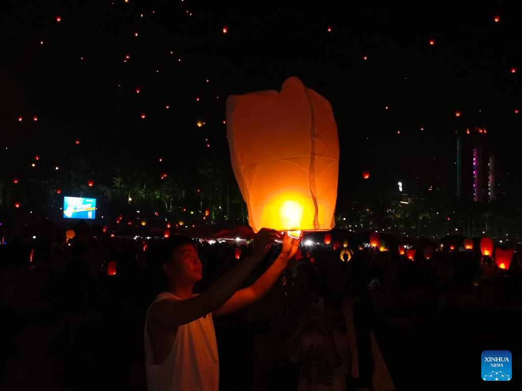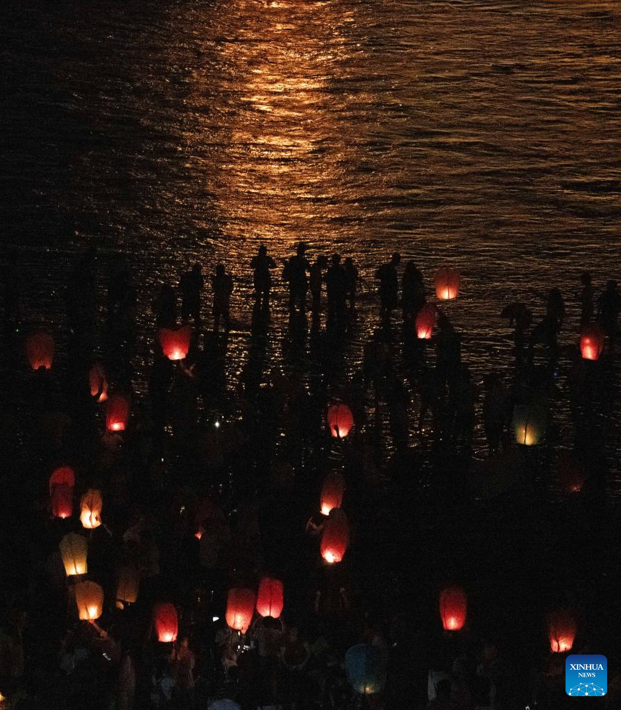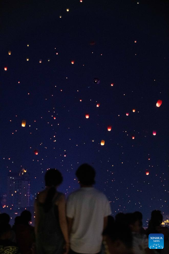 People fly Kongming lanterns, a kind of small hot-air paper balloon, by the Lancang River in Jinghong City, southwest China's Yunnan Province, April 13, 2024, to celebrate the New Year of the calendar of the Dai ethnic group. (Xinhua/Wang Jingyi)