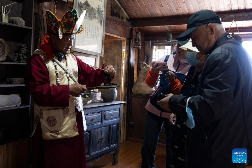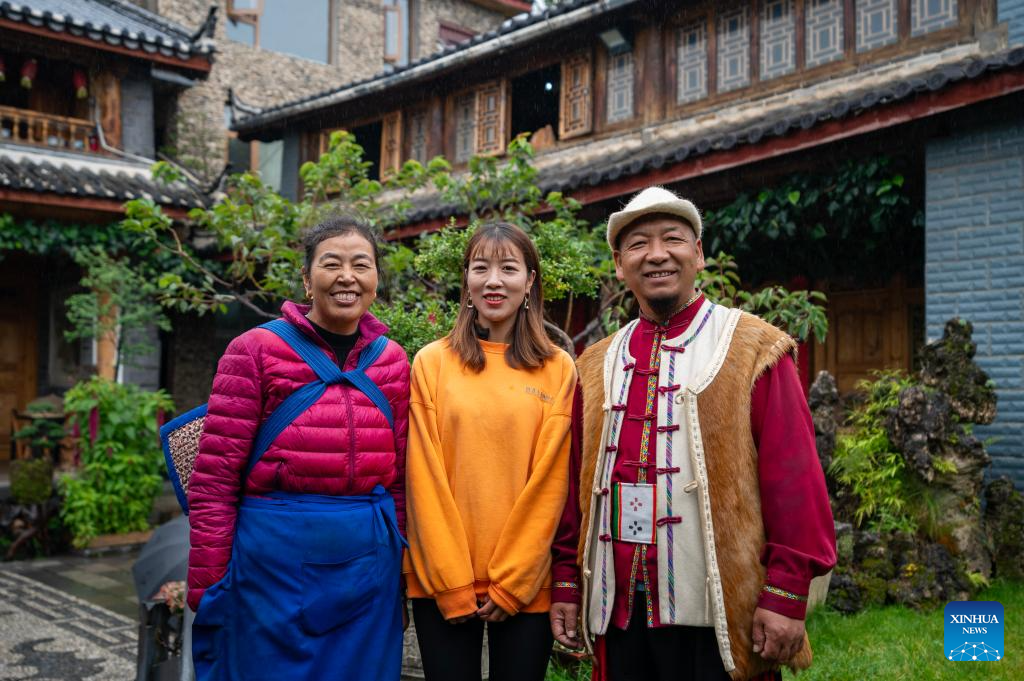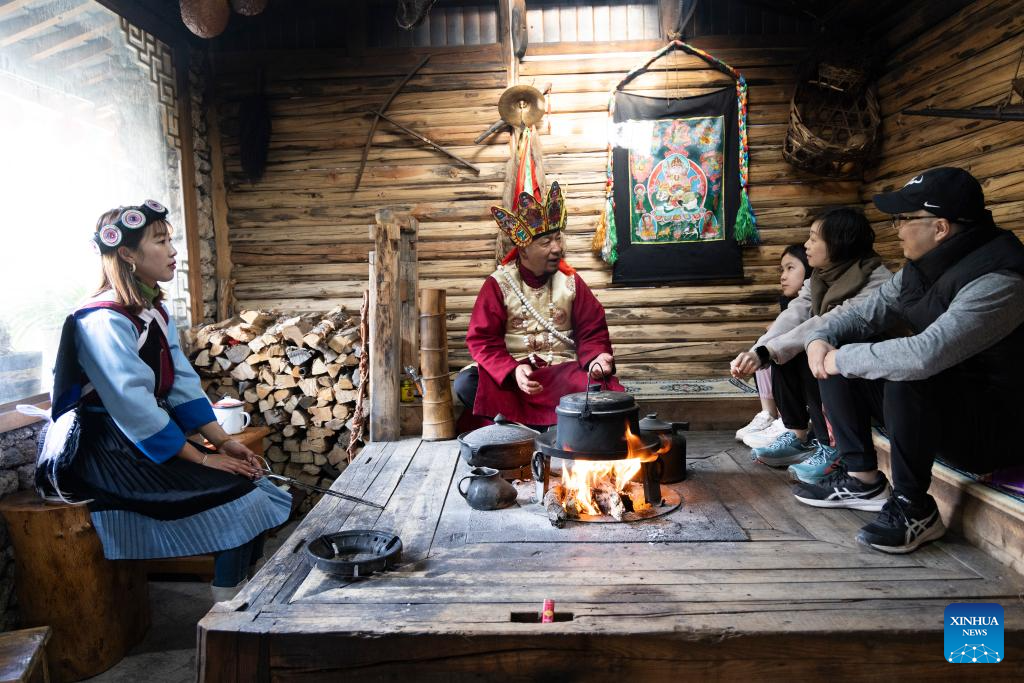 He Jielin (2nd L), and his daughter He Yuyue (1st L) introduce Naxi ethnic culture to tourists at home in Yuhu village, Lijiang City, southwest China's Yunnan Province, March 27, 2024. Living in Yuhu village at the foot of the Yulong Snow Mountain, He Jielin has witnessed the changes in this ancient Naxi village.