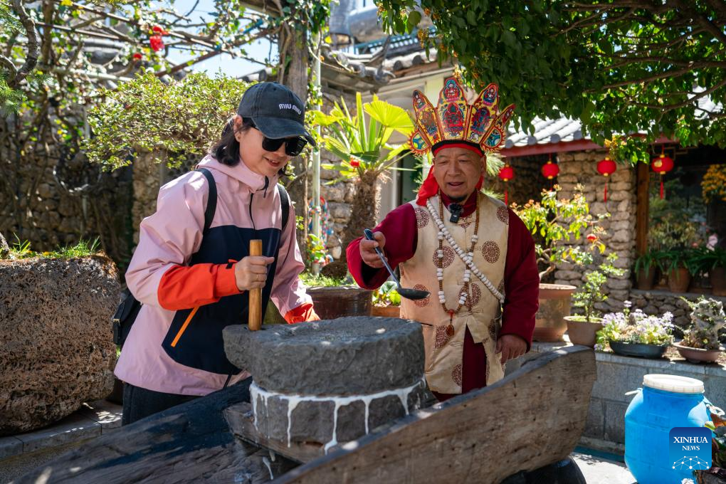 He Jielin (R) shows the traditional skills of making tofu to a tourist at home in Yuhu village, Lijiang City, southwest China's Yunnan Province, March 25, 2024. Living in Yuhu village at the foot of the Yulong Snow Mountain, He Jielin has witnessed the changes in this ancient Naxi village.