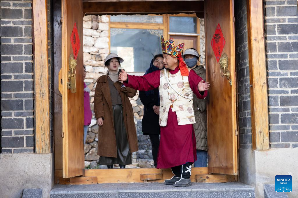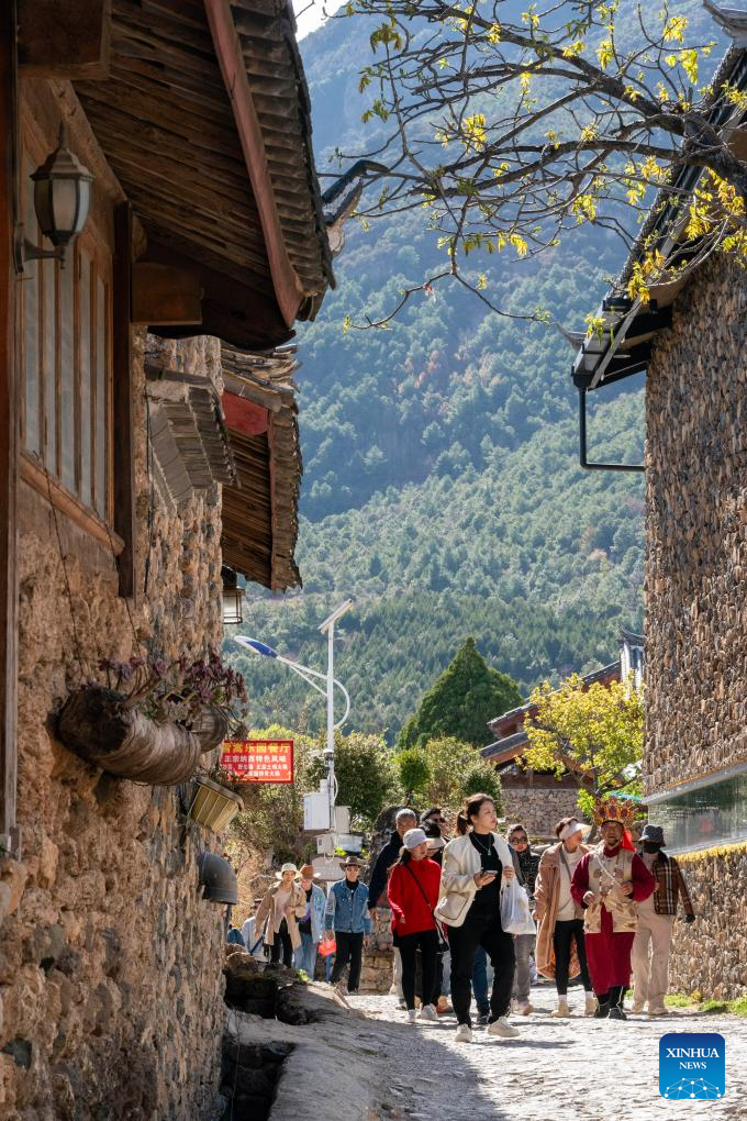 He Jielin guides tourists to his home in Yuhu village, Lijiang City, southwest China's Yunnan Province, March 27, 2024. Living in Yuhu village at the foot of the Yulong Snow Mountain, He Jielin has witnessed the changes in this ancient Naxi village.