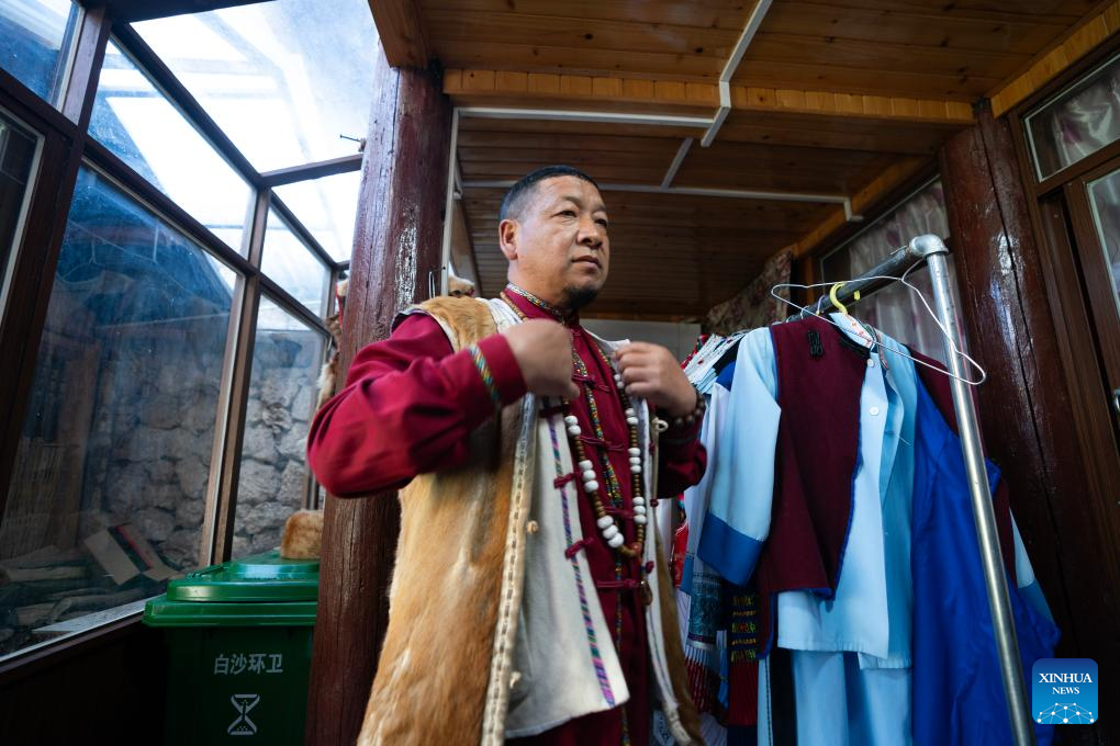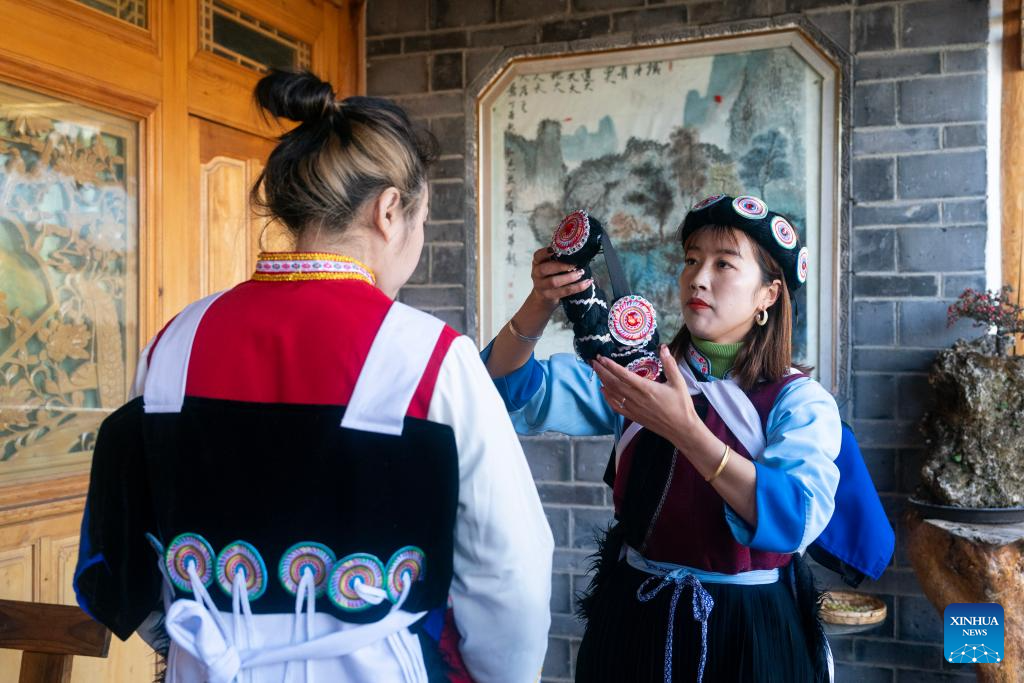 He Jielin puts on traditional costumes of Naxi ethnic group at home in Yuhu village, Lijiang City, southwest China's Yunnan Province, March 25, 2024. Living in Yuhu village at the foot of the Yulong Snow Mountain, He Jielin has witnessed the changes in this ancient Naxi village.