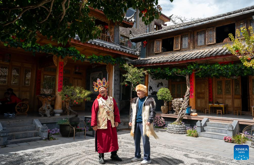 He Jielin (L) talks with a tourist wearing costumes of Naxi ethnic group in Yuhu village, Lijiang City, southwest China's Yunnan Province, March 25, 2024. Living in Yuhu village at the foot of the Yulong Snow Mountain, He Jielin has witnessed the changes in this ancient Naxi village.
