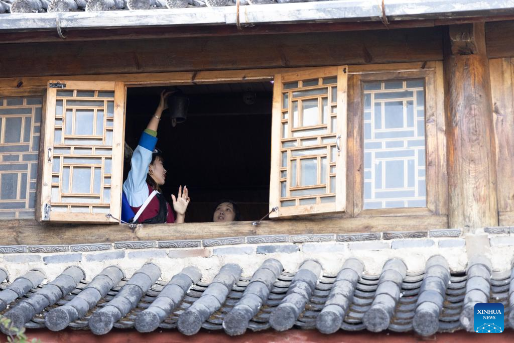 He Jielin (L) introduces old items to tourists at home in Yuhu village, Lijiang City, southwest China's Yunnan Province, March 27, 2024. Living in Yuhu village at the foot of the Yulong Snow Mountain, He Jielin has witnessed the changes in this ancient Naxi village.