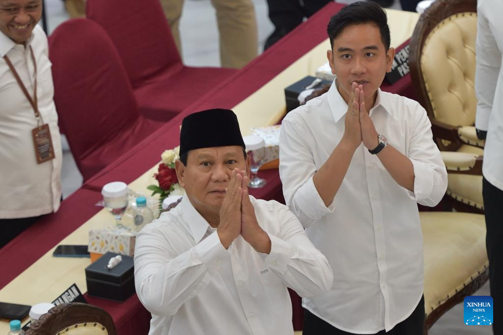 Prabowo Subianto (L) and Gibran Rakabuming greet the session participants at General Election Commission building in Jakarta, Indonesia, on April 24, 2024. Indonesia's General Election Commission (KPU) here on Wednesday declared Prabowo Subianto as the country's eighth president after appeals of two defeated presidential candidates concerning a dispute over presidential polls in February were rejected by the constitutional court.