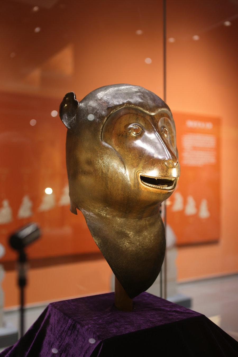 The bronze Chinese zodiac animal heads, including the ox, tiger, horse, monkey, and pig, originally from the Old Summer Palace, are on display at the Yungang Grottoes museum in Datong city, Shanxi province. [Photo provided to China Daily]