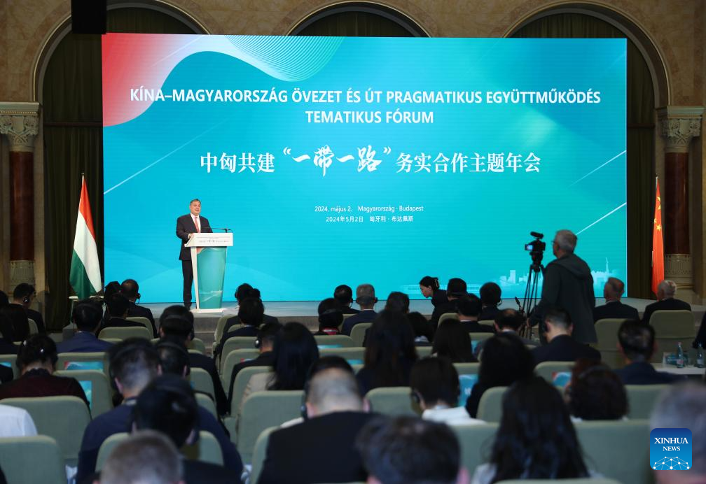 Hungarian Minister for National Economy Marton Nagy addresses a conference focused on cooperation between China and Hungary under the Belt and Road Initiative (BRI) framework in Budapest, Hungary, on May 2, 2024. Multiple achievements were made on Thursday at a conference focused on cooperation between China and Hungary under the Belt and Road Initiative (BRI) framework.