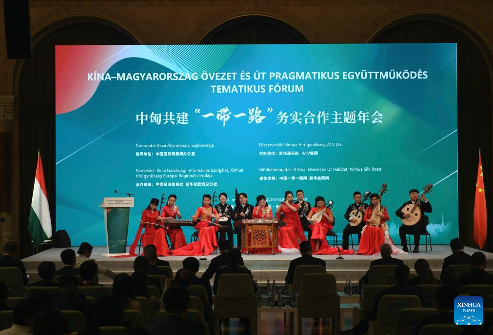This photo taken on May 2, 2024 shows a Chinese folk music performance staged during a conference focused on cooperation between China and Hungary under the Belt and Road Initiative (BRI) framework in Budapest, Hungary. Multiple achievements were made on Thursday at a conference focused on cooperation between China and Hungary under the Belt and Road Initiative (BRI) framework.