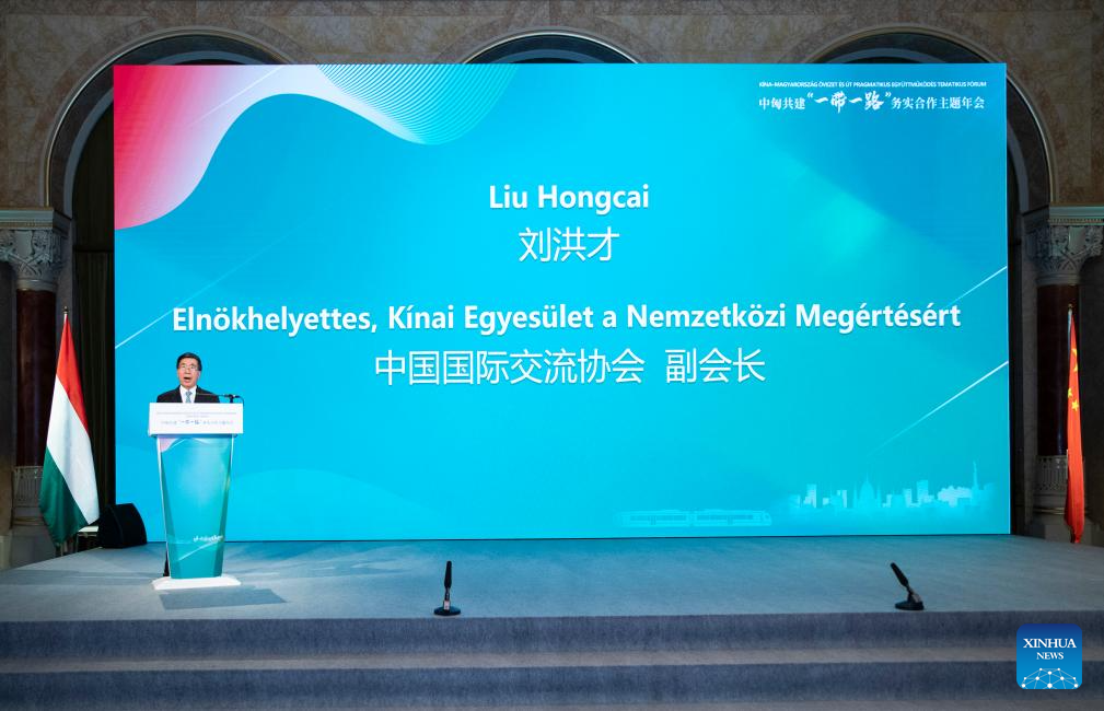 Liu Hongcai, deputy head of the Chinese Association for International Understanding, addresses a conference focused on cooperation between China and Hungary under the Belt and Road Initiative (BRI) framework in Budapest, Hungary, on May 2, 2024. Multiple achievements were made on Thursday at a conference focused on cooperation between China and Hungary under the Belt and Road Initiative (BRI) framework.