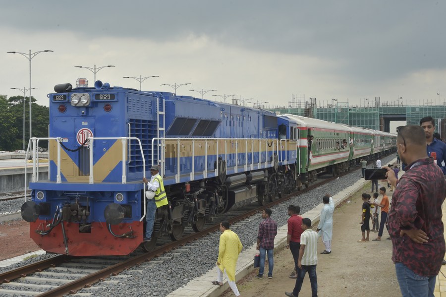 A man takes photos of a train ready for a trial run along the newly-constructed mega Belt and Road Initiative (BRI) rail line via the China-built Bangladesh's largest Padma Bridge on the outskirts of Dhaka, Bangladesh, Sept. 7, 2023.(Photo by Salim/Xinhua)
