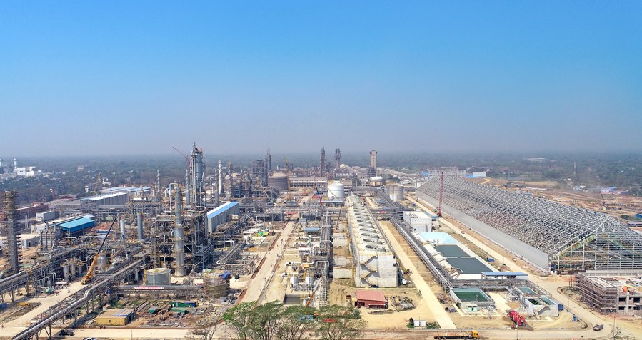 This aerial photo taken on April 15, 2023 shows a view of the construction site of Bangladesh's Ghorashal-Polash Urea Fertilizer Project in Narsingdi, Bangladesh. TO GO WITH "Feature: Bangladesh's first green fertilizer factory built under China's BRI nears completion" (Xinhua)