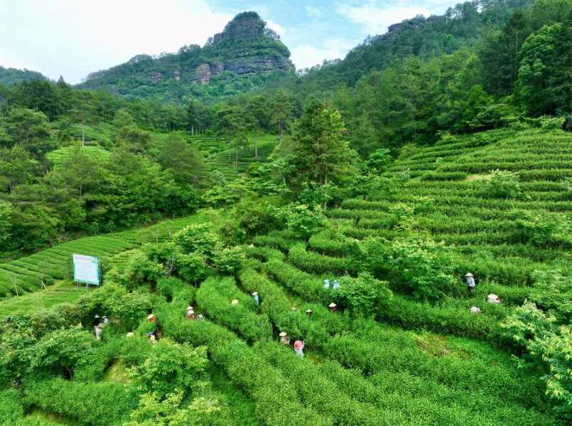 An aerial drone photo taken on May 7, 2024 shows workers picking tea leaves at a tea garden in Xingcun Town in Wuyishan City, east China's Fujian Province. (Xinhua/Jiang Kehong)