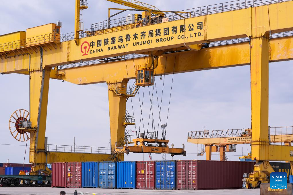 A frame crane handles containers at the load-transfer yard of the Horgos Port in Horgos, northwest China's Xinjiang Uygur Autonomous Region, May 29, 2024. (Xinhua/Wang Fei)
