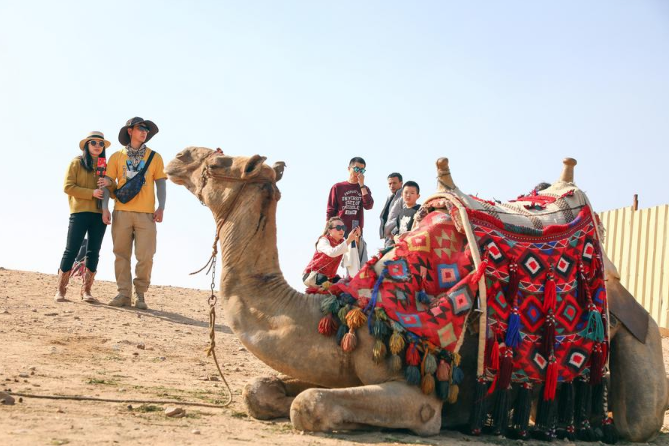Chinese tourists visit the Giza Pyramids scenic spot in Giza, Egypt, Feb. 8, 2024. (Xinhua/Ahmed Gomaa)