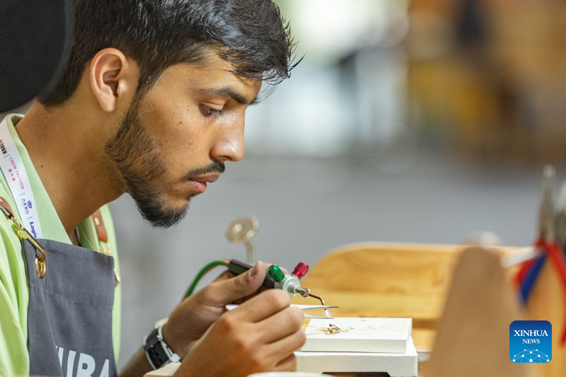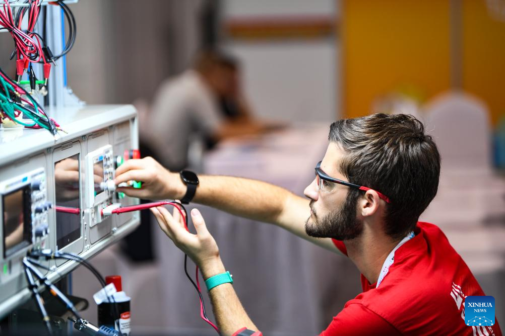 A contestant is pictured during a contest of the second Belt and Road International Skills Competition in southwest China's Chongqing Municipality on June 24, 2024. The second Belt and Road International Skills Competition kicked off at Chongqing International Expo Center here on Monday, attracting participants from 61 countries and regions. (Xinhua/Huang Wei)