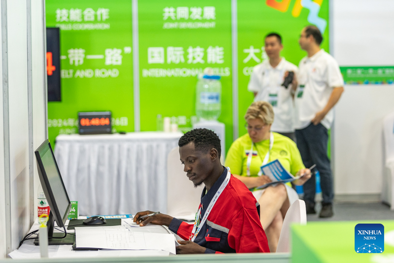 A contestant (front) is pictured during a contest of the second Belt and Road International Skills Competition in southwest China's Chongqing Municipality on June 24, 2024. The second Belt and Road International Skills Competition kicked off at Chongqing International Expo Center here on Monday, attracting participants from 61 countries and regions. (Xinhua/Wang Quanchao)