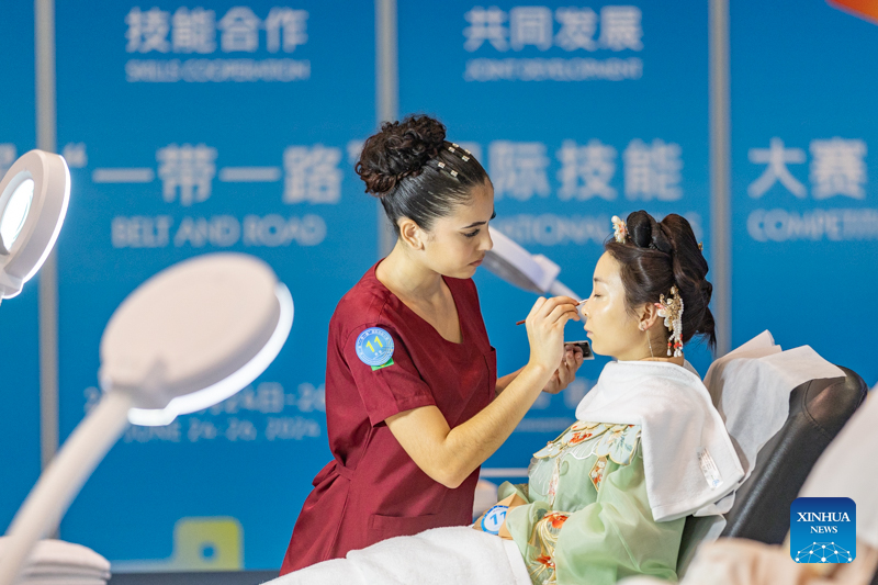 A contestant (L) is pictured during a contest of the second Belt and Road International Skills Competition in southwest China's Chongqing Municipality on June 24, 2024. The second Belt and Road International Skills Competition kicked off at Chongqing International Expo Center here on Monday, attracting participants from 61 countries and regions. (Xinhua/Huang Wei)