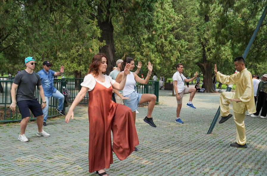 Tourists from Italy practice Tai Chi at the Tiantan (Temple of Heaven) Park in Beijing, capital of China, July 9, 2024. (Xinhua/Ju Huanzong)