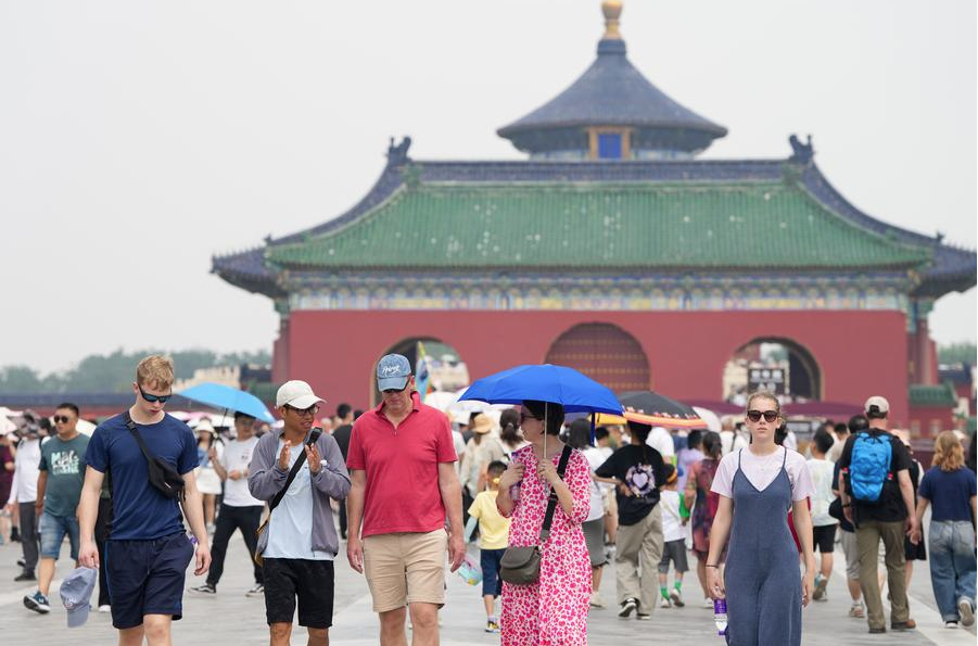 Foreign tourists take a tour with their guide at the Tiantan (Temple of Heaven) Park in Beijing, capital of China, July 9, 2024. (Xinhua/Ju Huanzong)