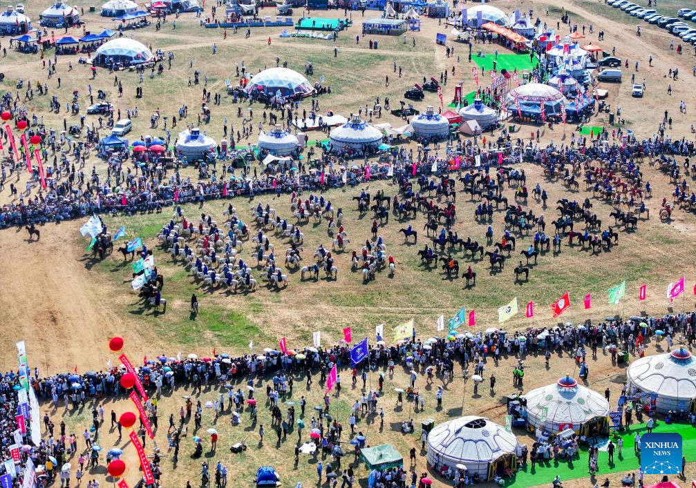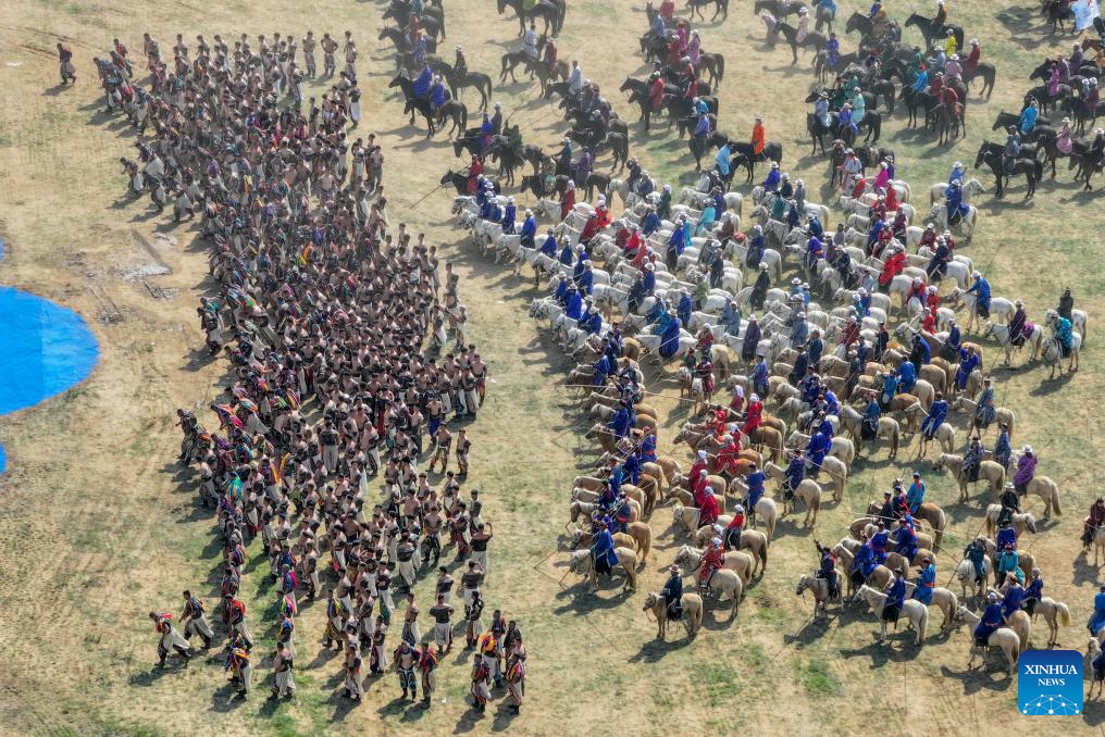 An aerial drone photo taken on July 14, 2024 shows the opening ceremony of the 34th Naadam festival in Xilin Gol League, north China's Inner Mongolia Autonomous Region.