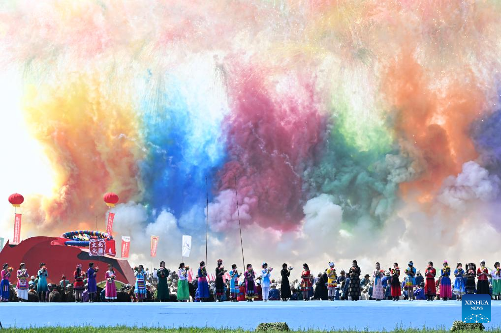 Artists perform during the opening ceremony of the 34th Naadam festival in Xilin Gol League, north China's Inner Mongolia Autonomous Region, July 14, 2024.