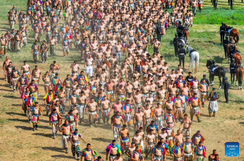 An aerial drone photo taken on July 14, 2024 shows wrestlers of traditional Mongolian style during the opening ceremony of the 34th Naadam festival in Xilin Gol League, north China's Inner Mongolia Autonomous Region.