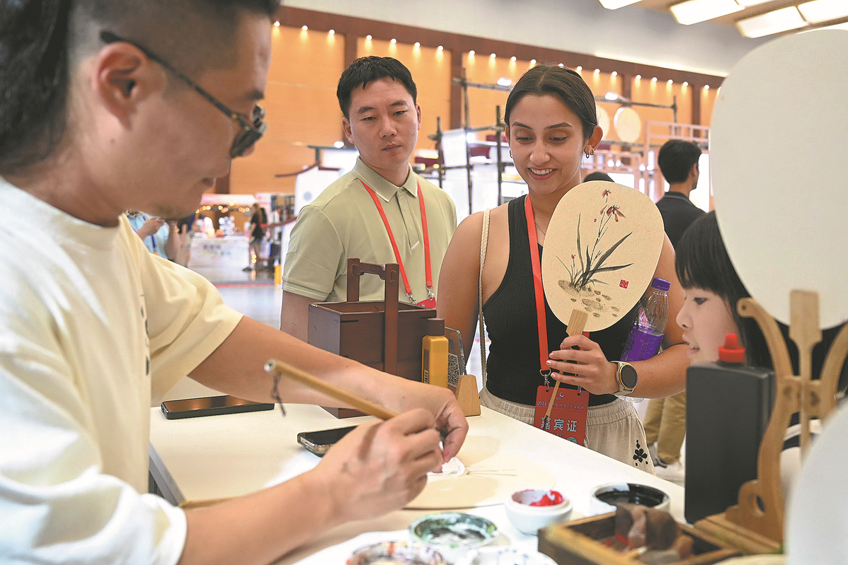 Festival participants look on as a Chinese artist paints on a fan. LIN SHANCHUAN/XINHUA