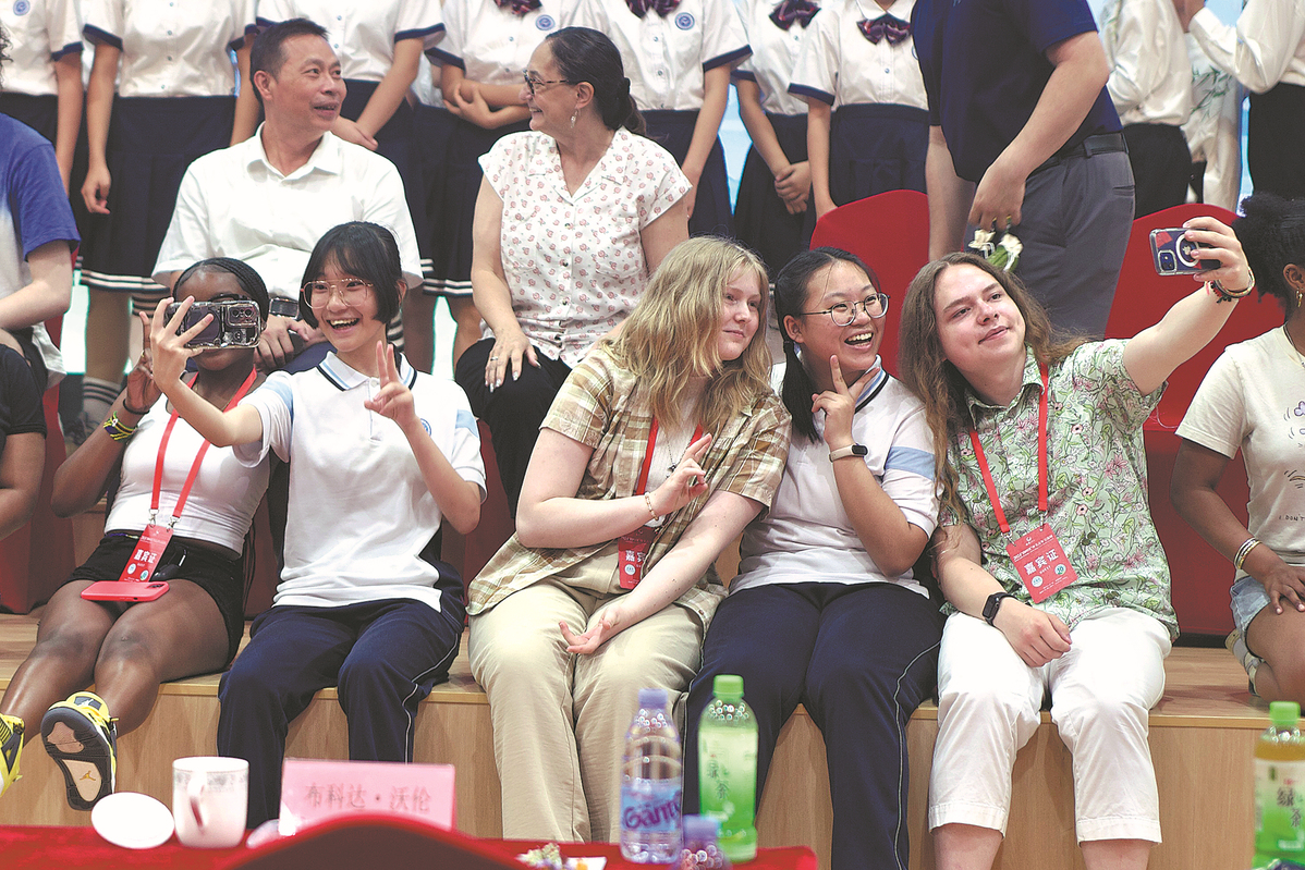A delegation from Tacoma in the US state of Washington, takes selfies with Chinese students while visiting the Affiliated High School of Fuzhou Institute of Education on June 26. HU MEIDONG/CHINA DAILY