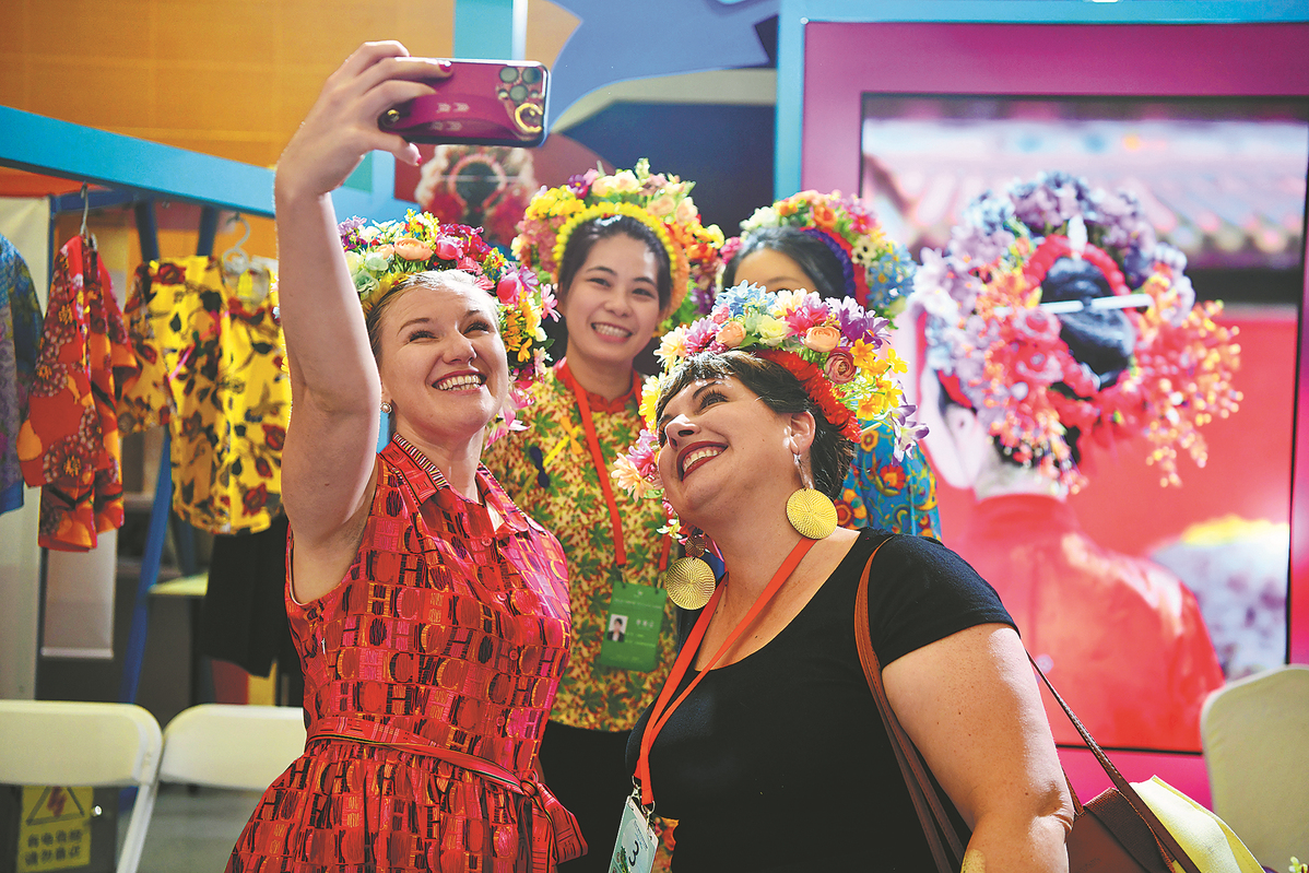 Guests in Xunpu floral headwear take a selfie during the festival in Fuzhou on June 26. WANG DONGMING/CHINA NEWS SERVICE