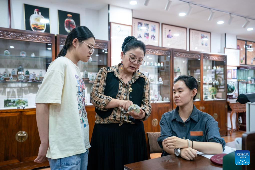 Sun Hongyan (L) explains inside painting technique to an apprentice at an art academy in Kunming, southwest China's Yunnan Province, July 3, 2024.(Xinhua/Hu Chao)