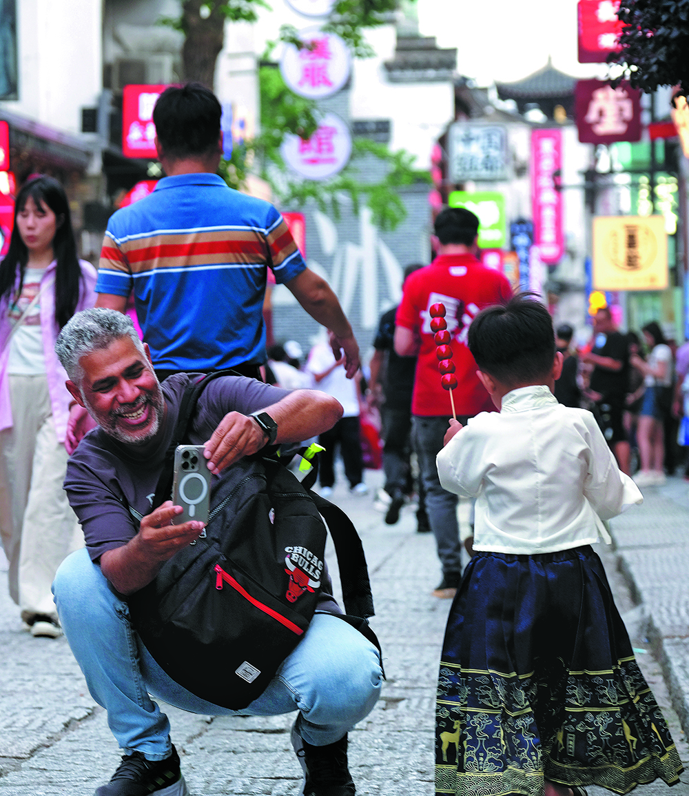 A foreign tourist takes pictures of a child wearing traditional Chinese apparel in Changsha, Hunan province, on May 14. [Photo provided to China Daily]